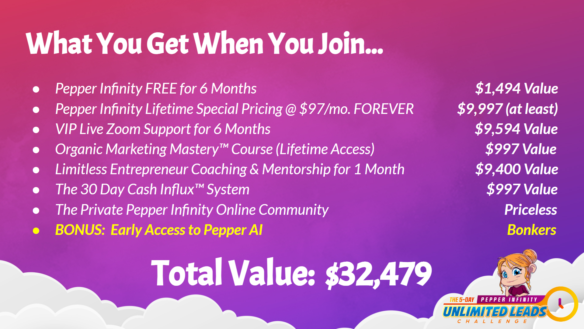 Limited-time offer. When you purchase on this page, you will receive 6 months of Pepper Infinity for FREE and after the first 6 months expire, you will have lifetime special pricing for Pepper Infinity at $97/mo. for as long as you are a customer!